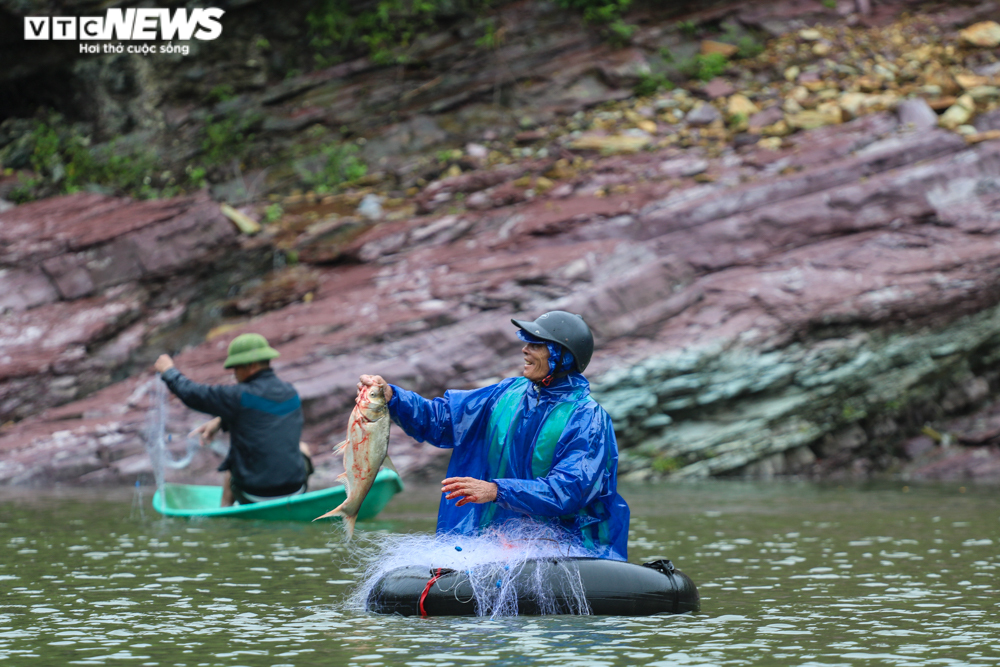 Người dân dùng thuyền gỗ hoặc đơn giản là ruột xe ô tô để bơi ra giữa dòng nước bắt cá.