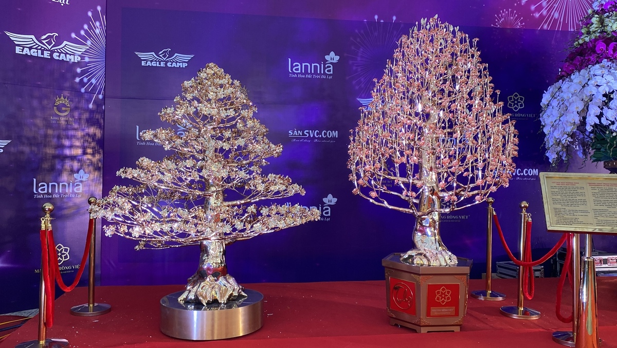 Tại gian hàng hoa Tết trước sân vận động Mỹ Đình (quận Nam Từ Liêm, Hà Nội) xuất hiện hai cây đào và mai mạ vàng được cho là lớn nhất Việt Nam, có giá bán gần 3 tỷ đồng/cây. Cặp cây độc đáo này đều được đúc từ đồng nguyên khối và mạ vàng 24k.