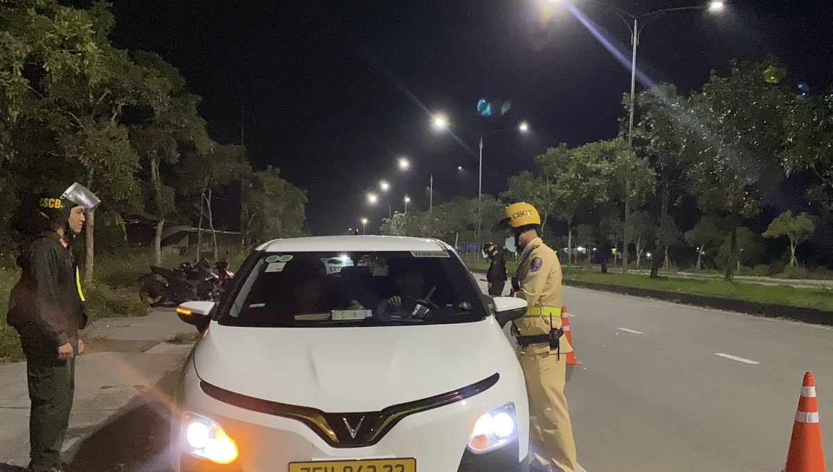 Ghi nhận tại chốt kiểm tra nồng độ cồn của Đội CSGT đường bộ số 1 (Phòng CSGT Công an TP Huế), các cán bộ, chiến sĩ làm nhiệm vụ ra tín hiệu dừng, kiểm tra nồng độ cồn nhiều loại phương tiện lưu thông trên đường.