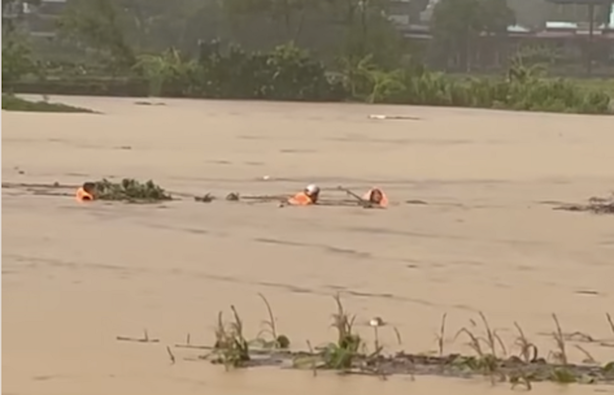 Hình ảnh Đại uý Nguyễn Văn Quỳnh cứu người phụ nữ bị lũ cuốn trôi.