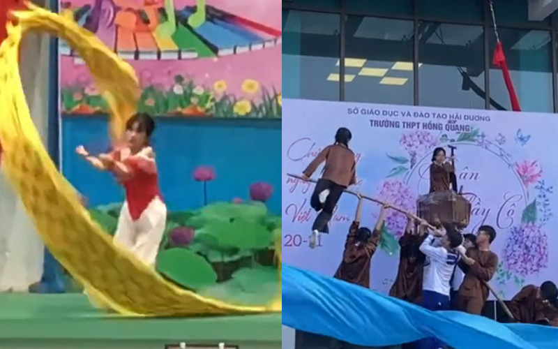 Tiết mục múa quạt trên trống được cư dân mạng đánh giá là "đỉnh" trong dịp 20/11 năm nay, khiến nhiều người nhận xét là họ cảm giác như đang xem biểu diễn xiếc chuyên nghiệp. Trong đoạn clip, hai học sinh vừa đi trên trống vừa múa với chiếc quạt lớn. Một vũ công khác thể hiện màn nhào lộn cực khó trong khi tay chỉ bám vào hai cây tre được dựng một cách chông chênh.