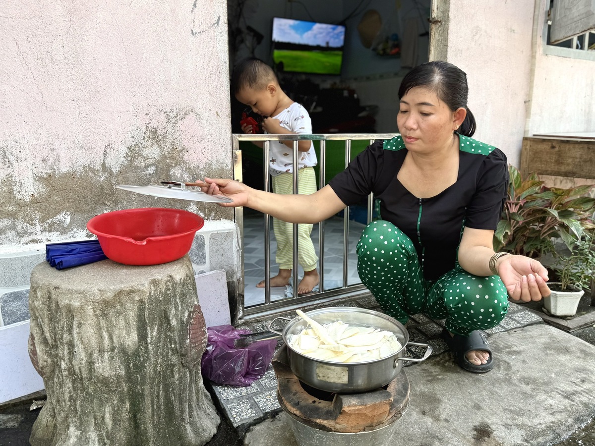 "Vợ chồng nó đứa lớn lớp 8 rồi, đứa nhỏ 3 tuổi bà đang trông đây. Gửi nhà trẻ thì tốn, nên tôi xuống vừa trông cháu vừa nấu ăn cho tụi nó luôn", bà Thơm cho hay.