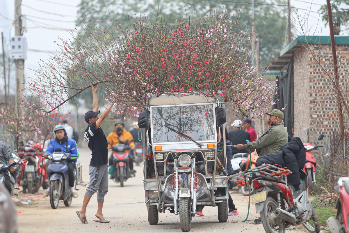 Từ sáng sớm đến chiều muộn, dòng người và xe cộ ra vào làng đào Nhật Tân tấp nập, kéo dài hai bên trục đường chính, tạo nên khung cảnh nhộn nhịp báo hiệu mùa xuân đang đến rất gần.