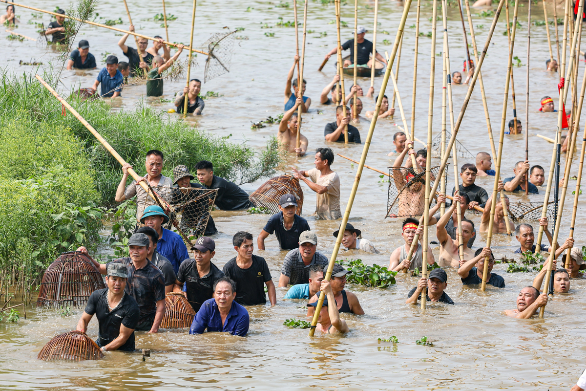 Khi dồn cá về điểm cuối, mọi người đưa cá lên bờ, sau đó quay lại đầu sông để tiếp tục vòng dập mới.