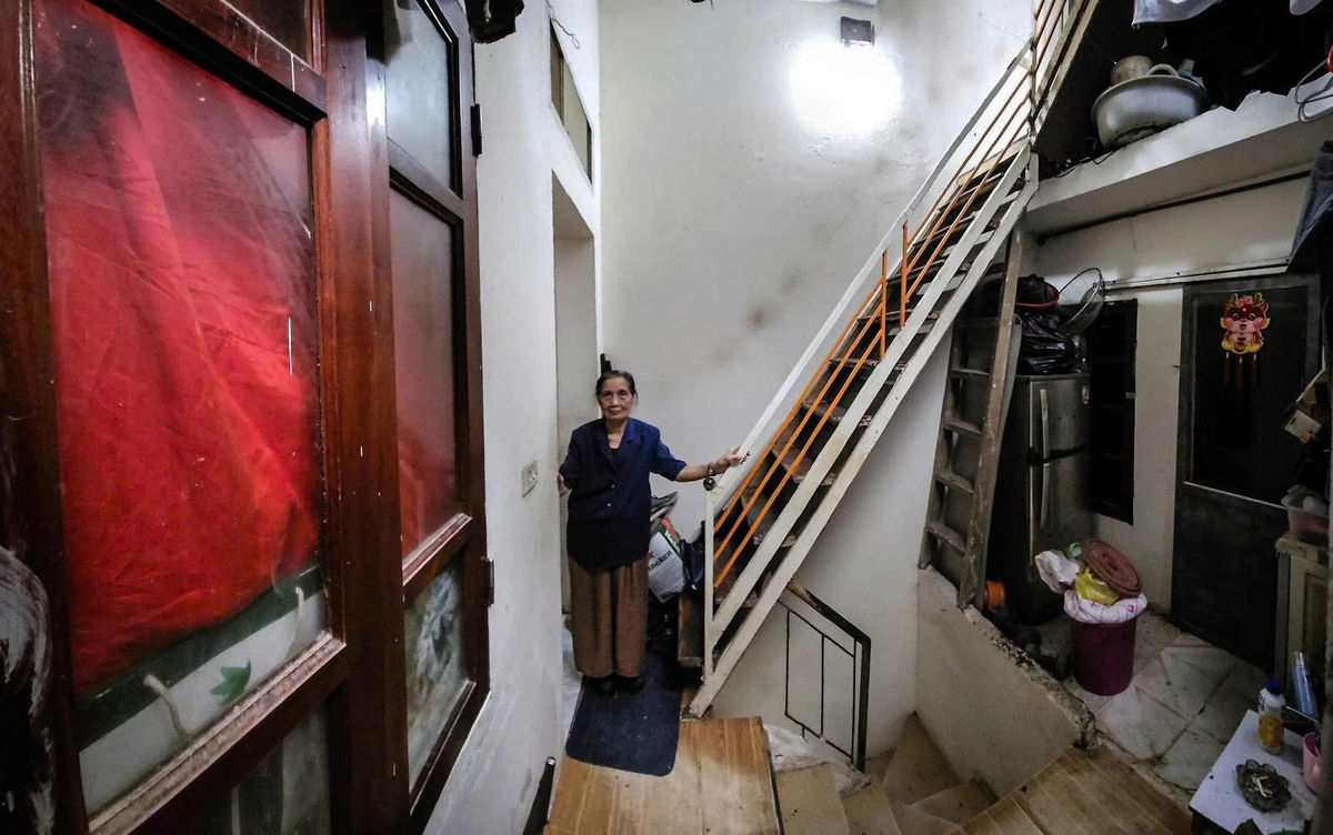 Cầu thang tối tăm, chật hẹp này là lối đi quen thuộc của gia đình bà Trần Thị Tuyết (55 tuổi) từ lúc bà sinh ra, lớn lên, lập gia đình và sinh con. "2/3 cuộc đời đã gắn với mảnh đất này. Khi nghe thông tin phải chuyển đi, tôi mất ăn mất ngủ nhiều đêm vì buồn", bà Tuyết ngậm ngùi.