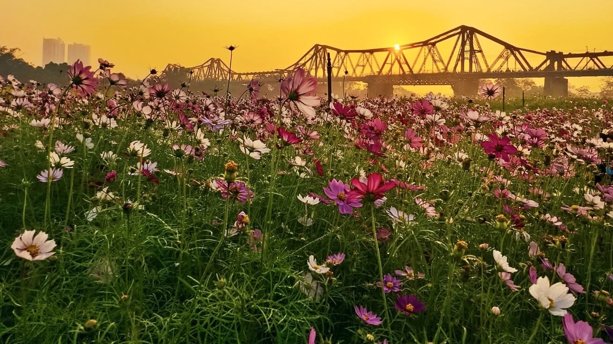 Sự xuất hiện của thảm hoa cũng khiến nơi đây trở thành điểm chụp ảnh được giới trẻ và những người yêu nhiếp ảnh lựa chọn. Phông nền là những luống hoa rực rỡ, phía trên là cây cầu Long Biên mang dấu ấn thời gian, tạo nên khung hình vừa gần gũi, vừa đặc trưng của Hà Nội.