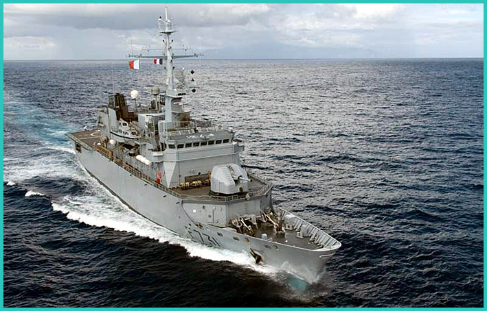 Prairial của hải quân Pháp thuộc lớp Floreal dài 93m, có lượng giãn nước 2.600 tấn (3.000 tấn khi đầy tải), lườn rộng nhất 14m, mớn nước 4,3m. (Ảnh: Wikipedia)