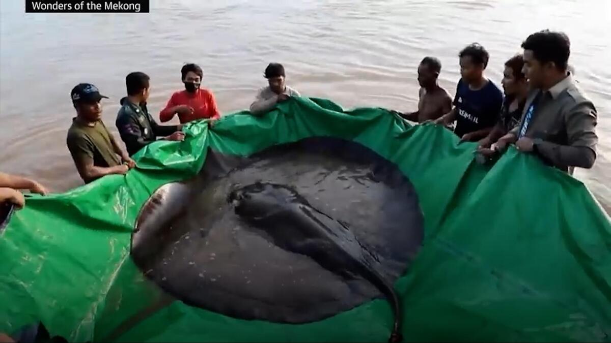 Ngư dân Campuchia cùng các nhà khoa học Mỹ đã bắt được con cá đuối gai dài gần 4 mét, nặng 300 kg trên sông Mê Kông.